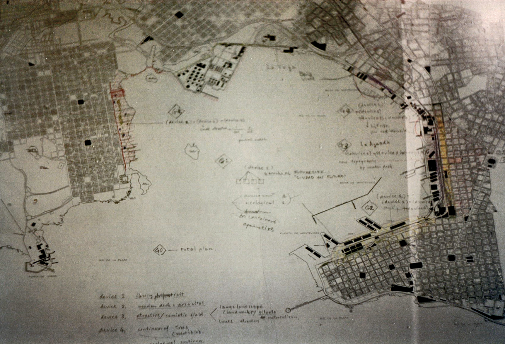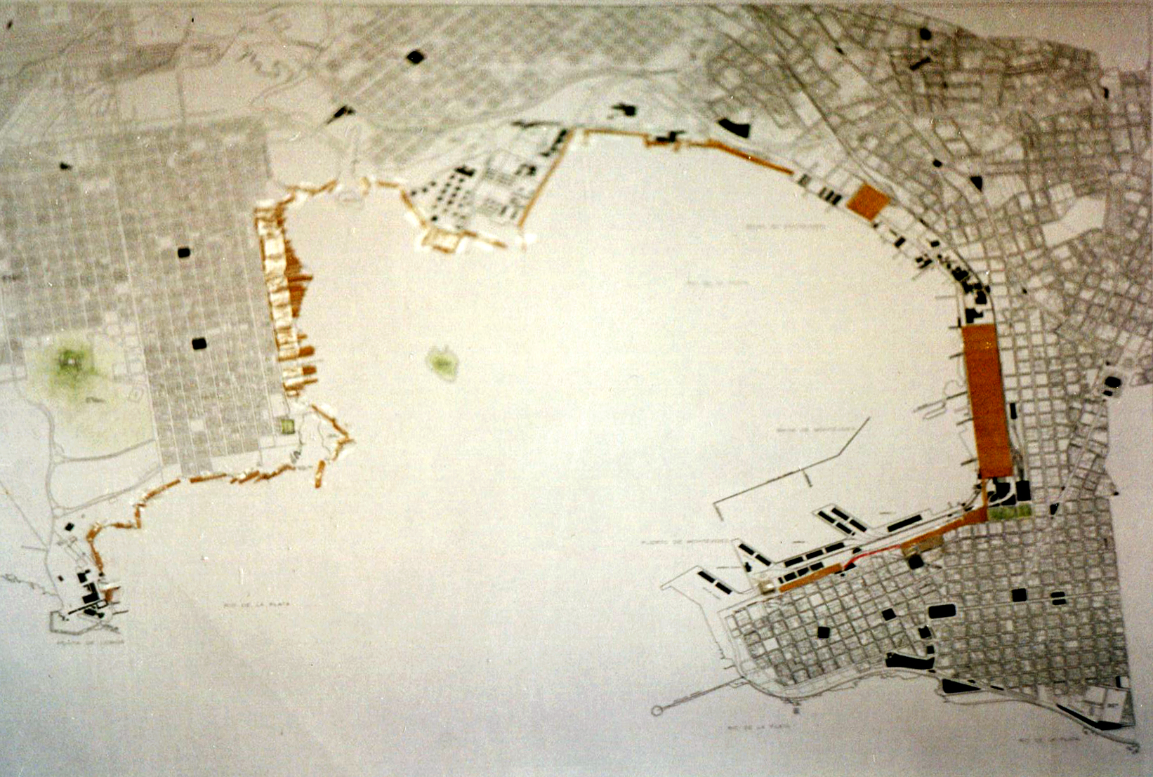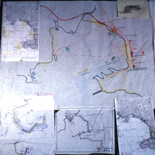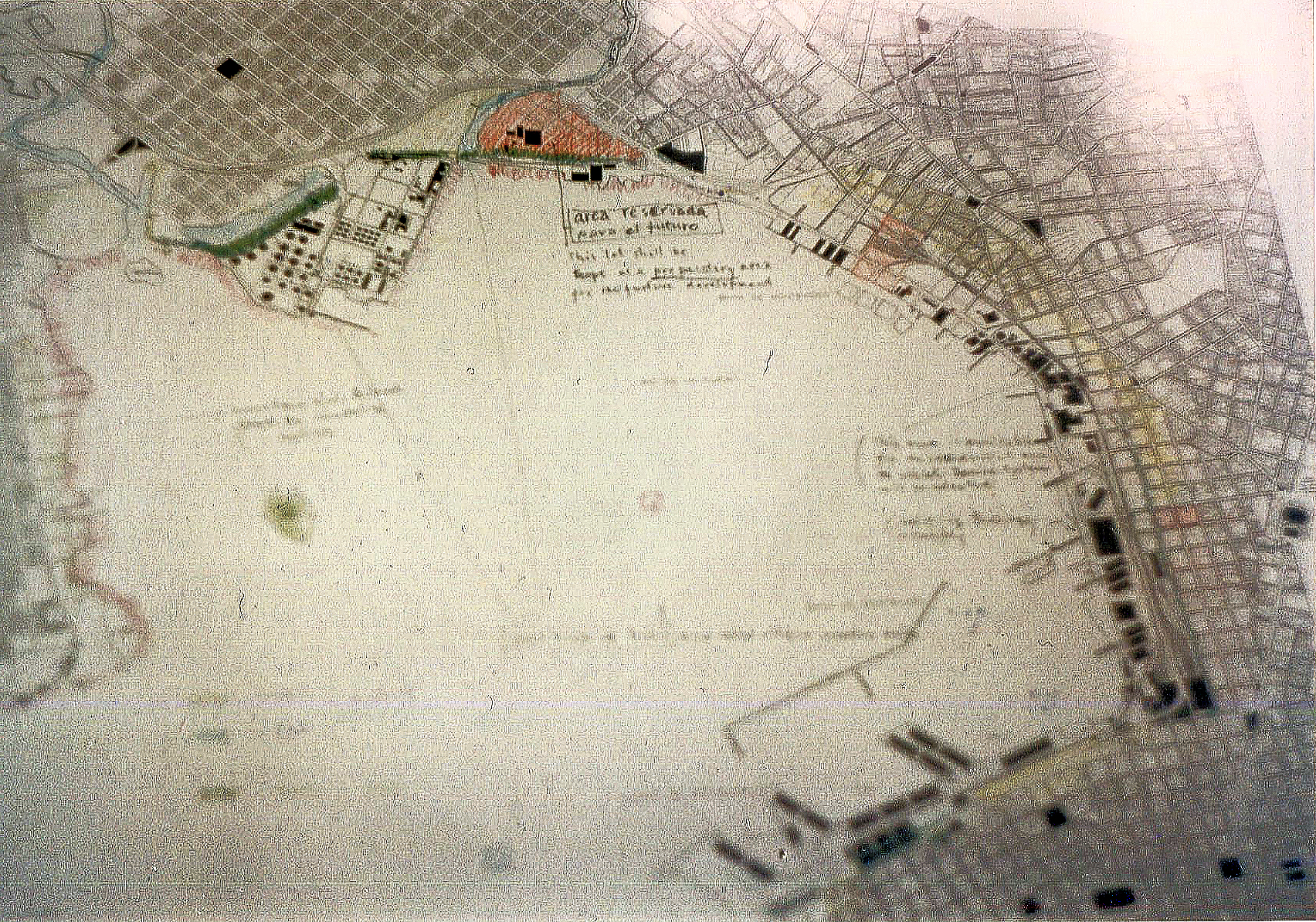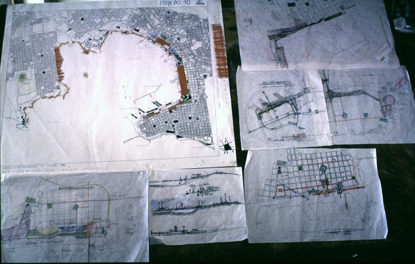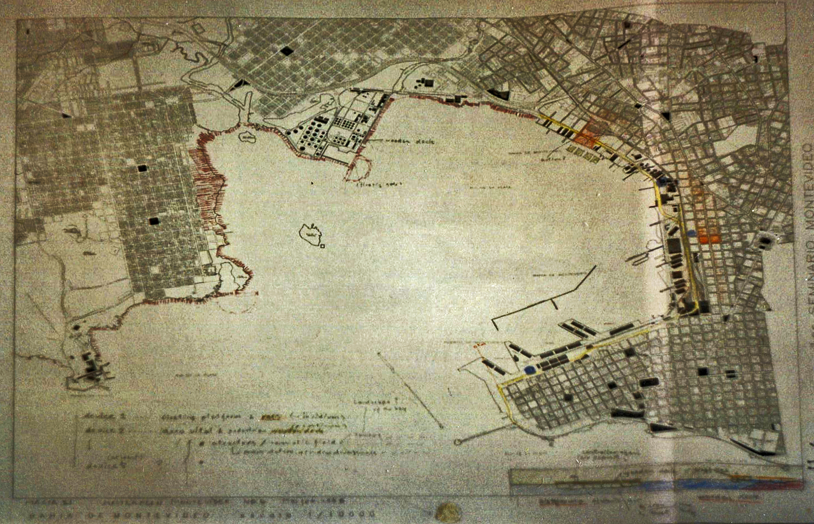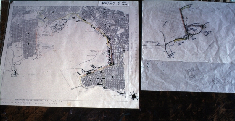 Como mecanismo de desarrollo de nuestro proyecto, decidimos llevar un diario, consistente en un mapa de Montevideo con sus referencias por cada grupo. Dividimos a los 20 integrantes del taller en cinco grupos, según los temas: puerto, transporte, industria, naturaleza y áreas residenciales y comerciales. Aquí no tenemos tiempo suficiente para explicar el trabajo de cada grupo, pero quisiera mostrar como ejemplo el mapa del grupo de naturaleza, donde se muestra la vegetación existente a lo largo del borde de la bahía.