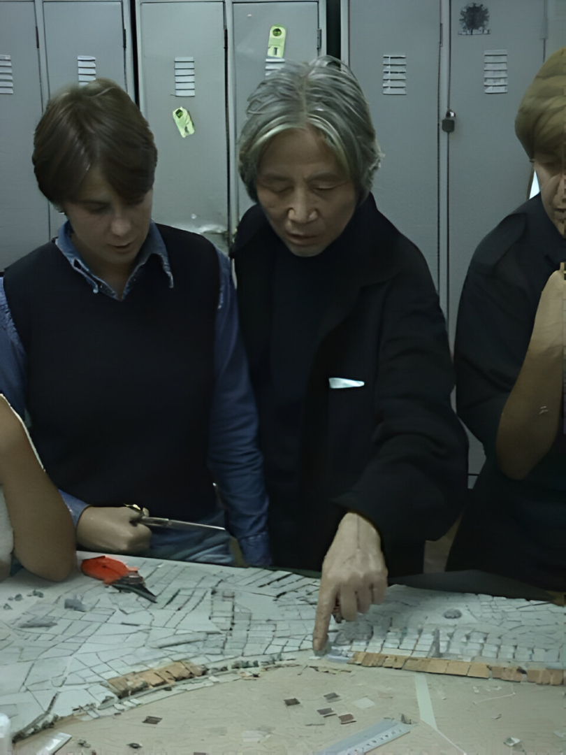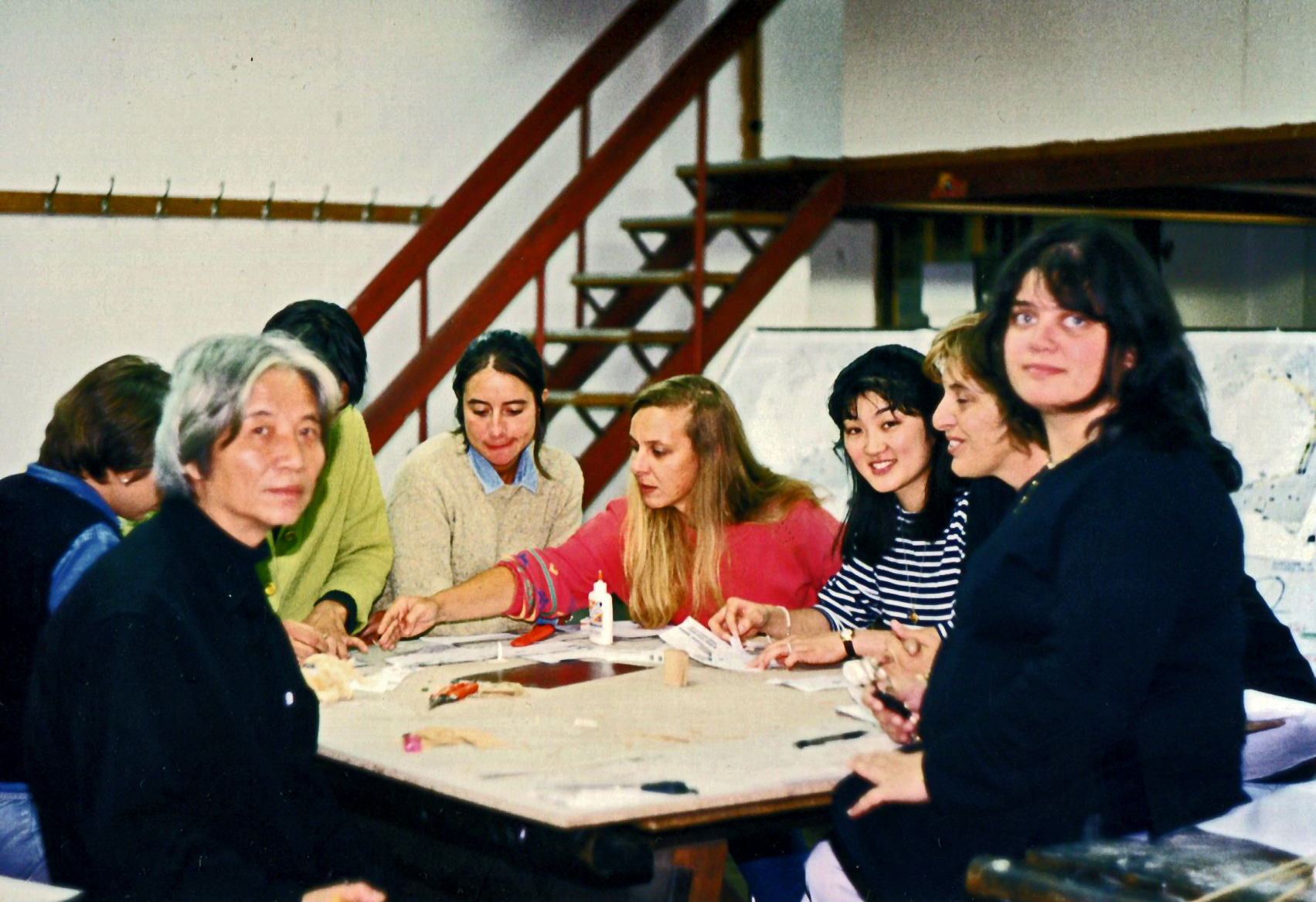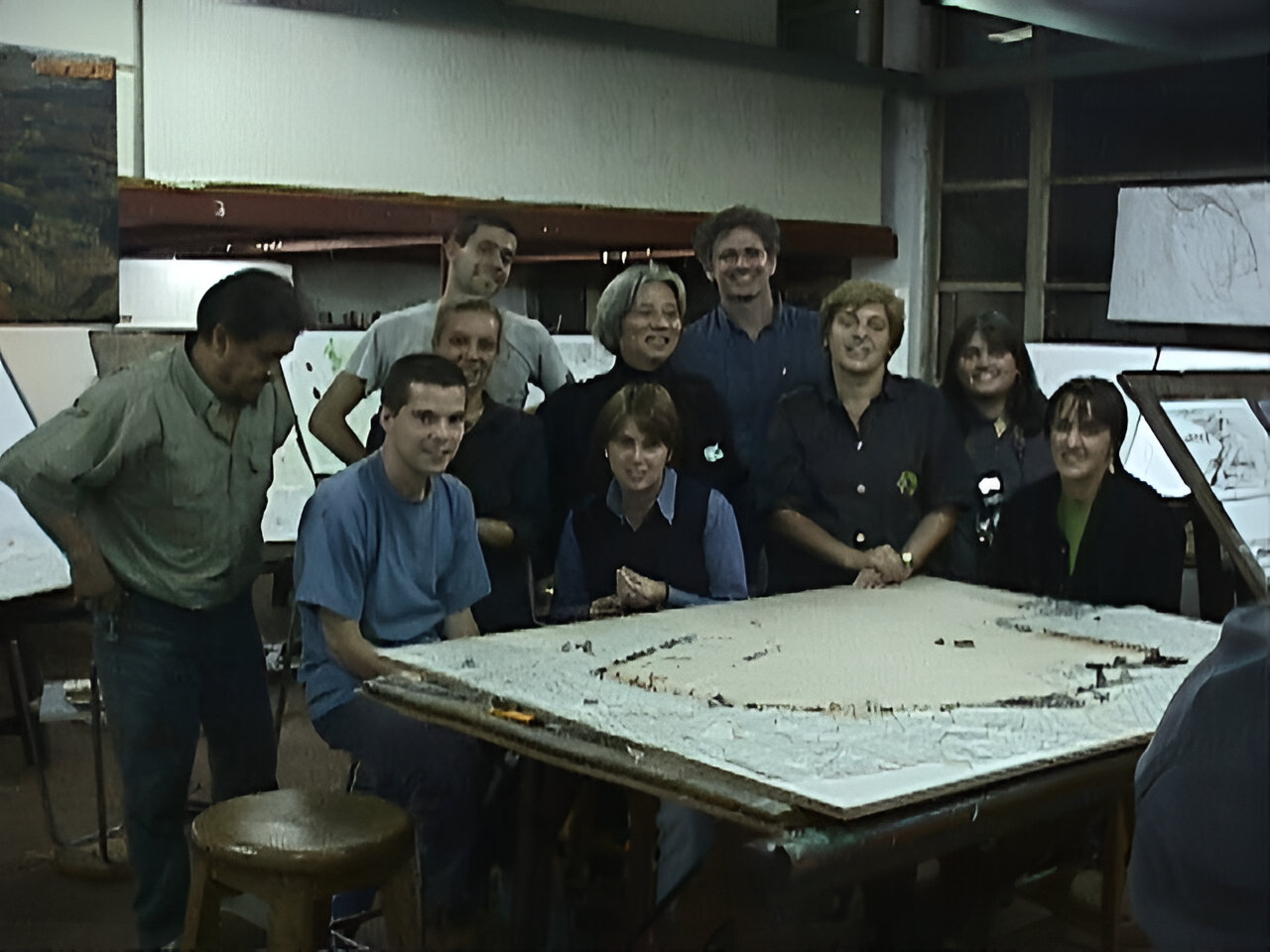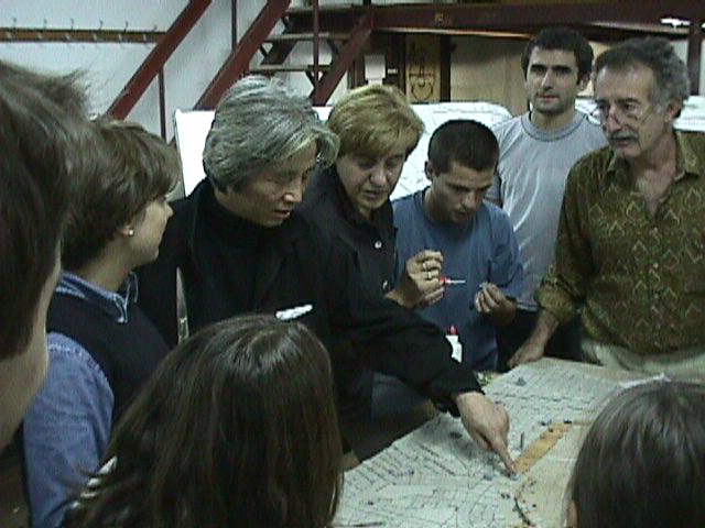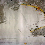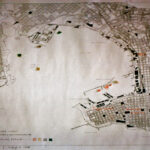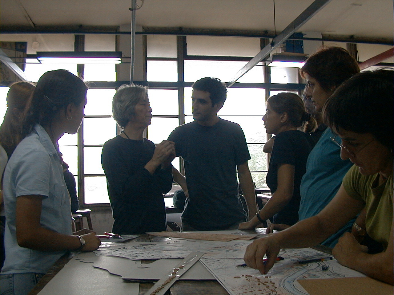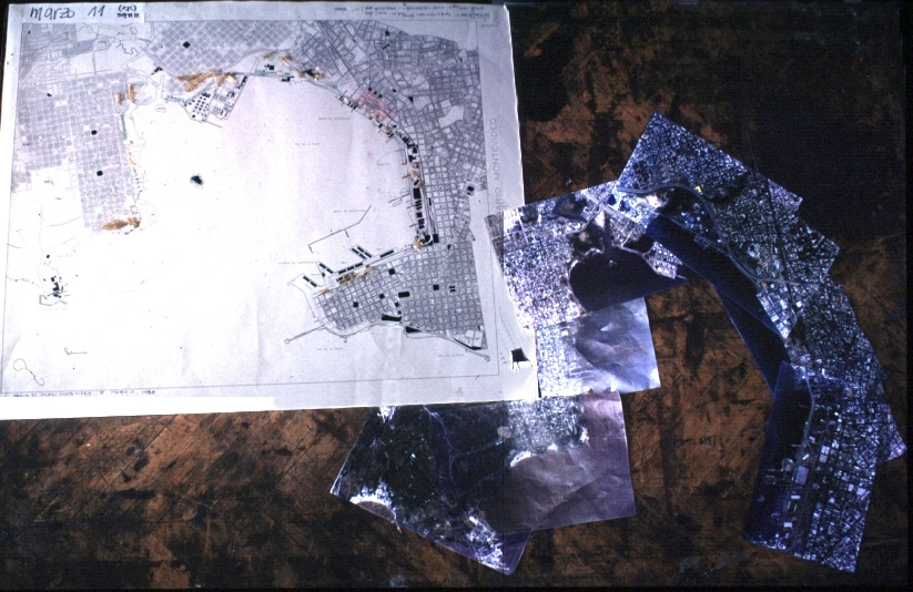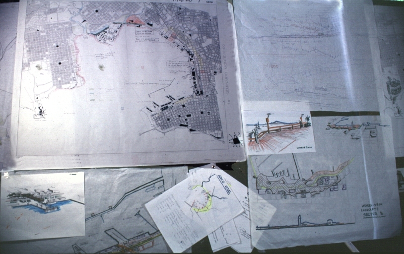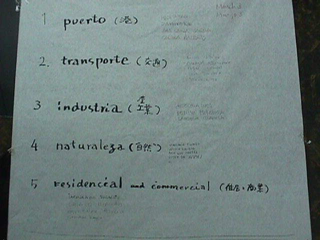 Como mecanismo de desarrollo de nuestro proyecto, decidimos llevar un diario, consistente en un mapa de Montevideo con sus referencias por cada grupo. Dividimos a los 20 integrantes del taller en cinco grupos, según los temas: puerto, transporte, industria, naturaleza y áreas residenciales y comerciales. Aquí no tenemos tiempo suficiente para explicar el trabajo de cada grupo, pero quisiera mostrar como ejemplo el mapa del grupo de naturaleza, donde se muestra la vegetación existente a lo largo del borde de la bahía.