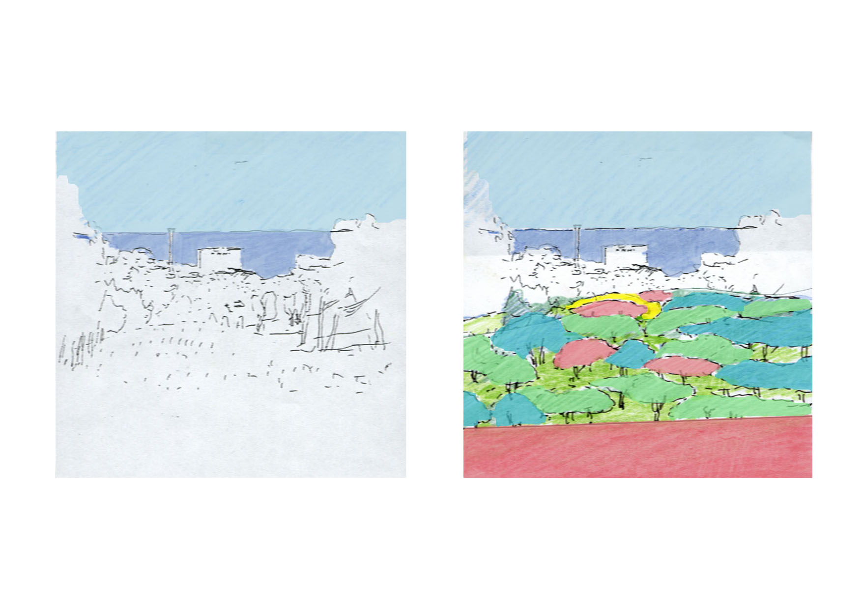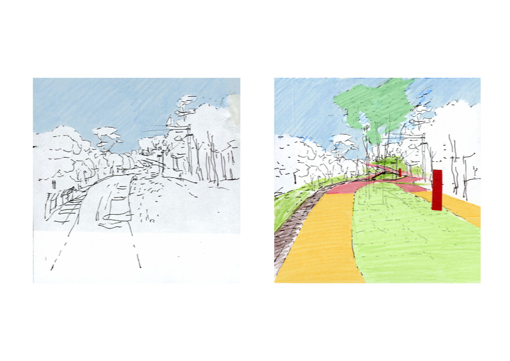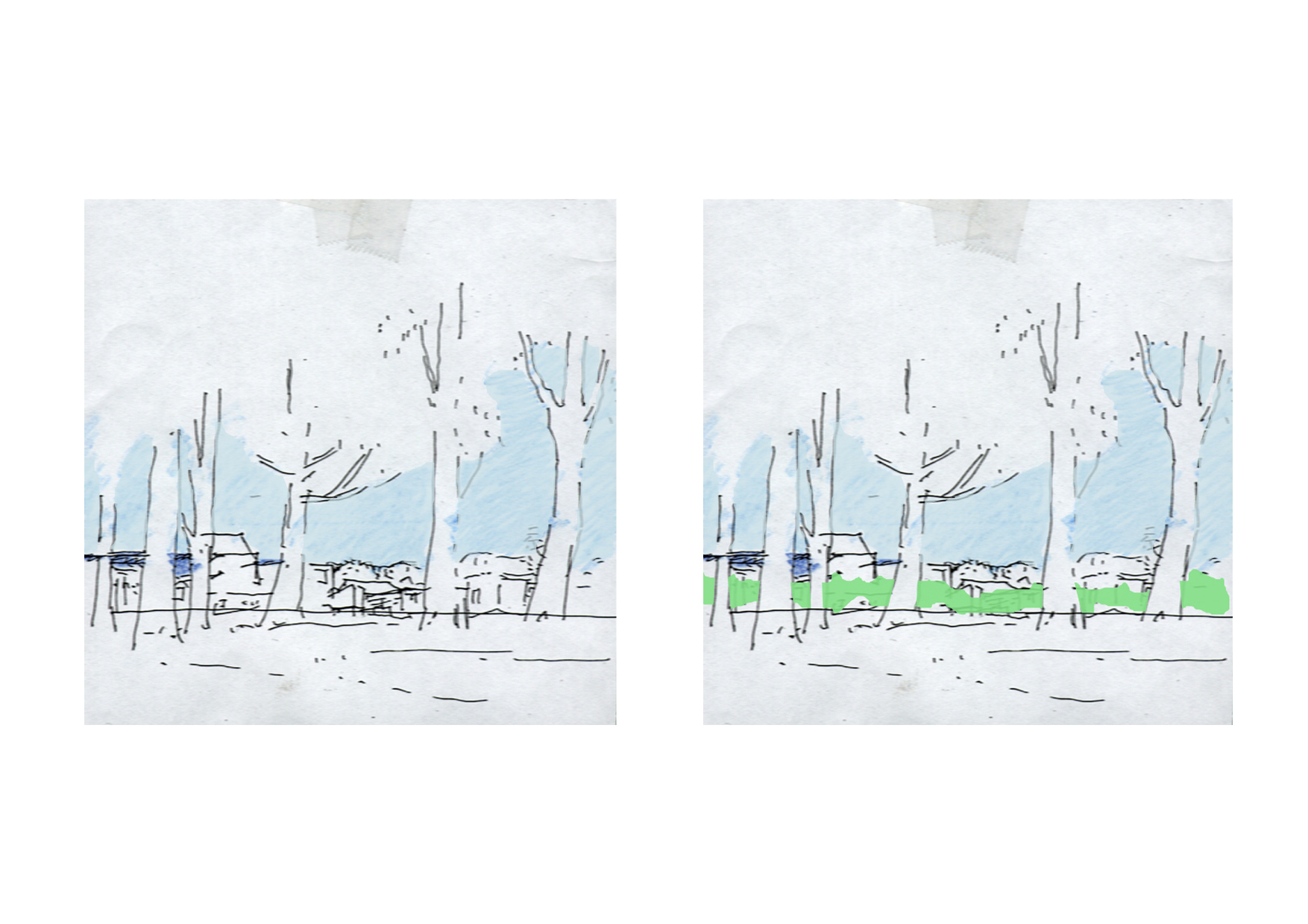 Proponemos tres tipos de refuerzo de la vegetación en distintas zonas. Como árboles, cercos vegetales y césped. Especialmente, los árboles y cercos son efectivos para crear zonas de amortiguación entre el espacio público y las viviendas próximas.