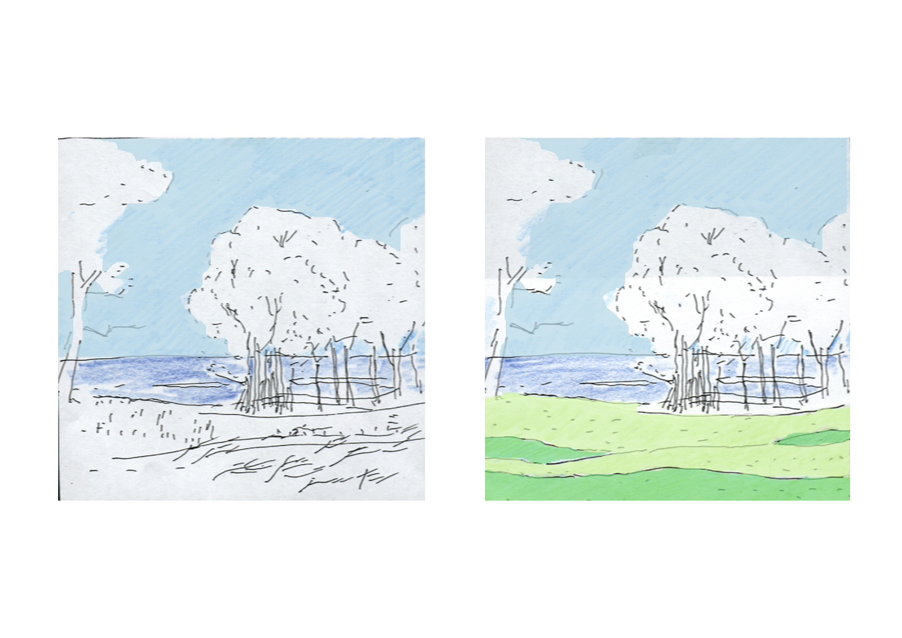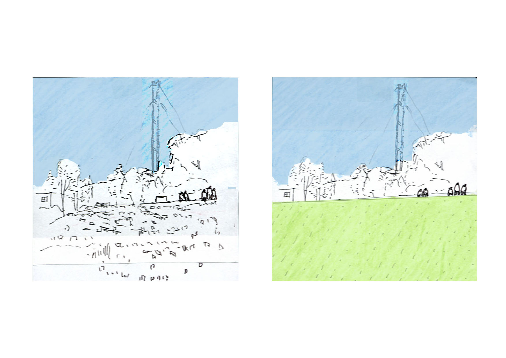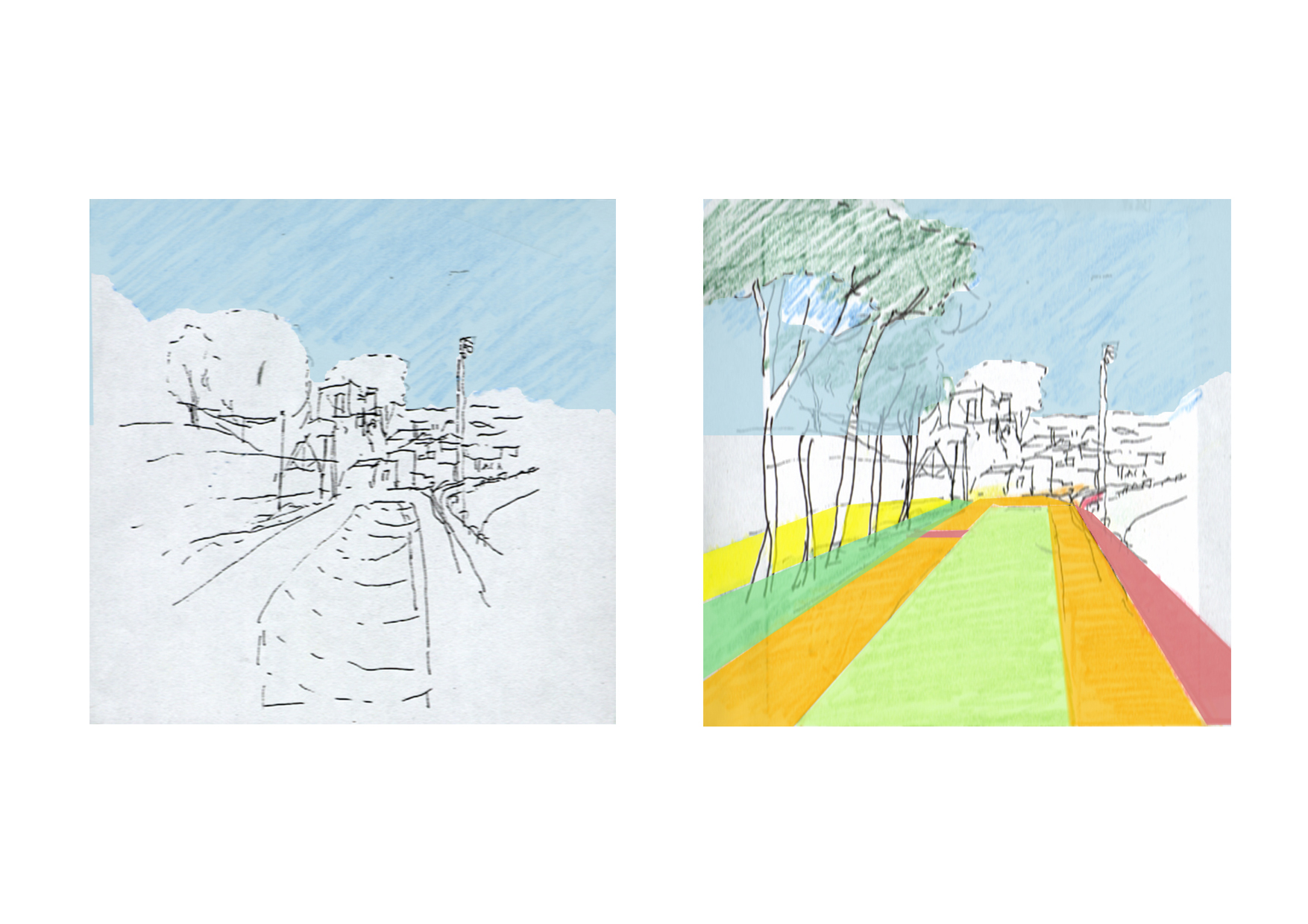 Proponemos tres tipos de refuerzo de la vegetación en distintas zonas. Como árboles, cercos vegetales y césped. Especialmente, los árboles y cercos son efectivos para crear zonas de amortiguación entre el espacio público y las viviendas próximas.