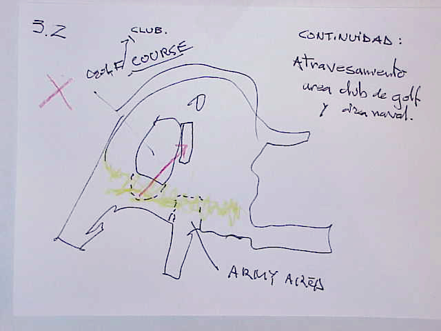 Para conectar las dos playas, hoy separadas, necesitamos usar el dominio que hoy pertenece a la Armada y al Club de Golf. El el caso de la cancha de golf, podemos trasladar 2 o 3 hoyos a otra zona (punto A2). En el caso del predio de la Armada, debemos esperara por su ofrecimiento a la ciudadanía (punto B).