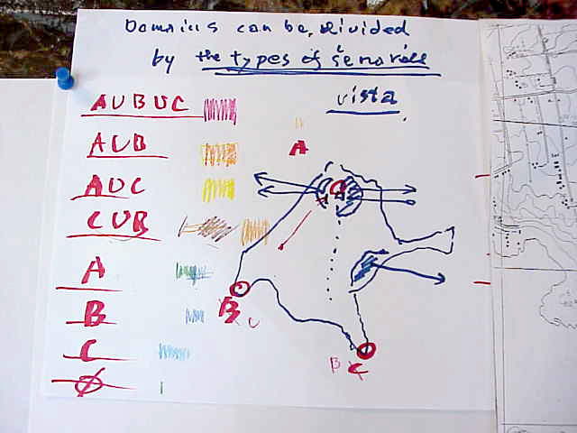 Como investigación básica, elaboramos el primer mapa, que muestra tres tipos de dominios. Desde el dominio ∝ se puede ver la ciudad. Desde el dominio β se pude ver el Río. Desde el dominio Ф no se puede ver ambos. Ahora, podemos dividir nuestro parque en tres tipos de dominios, esto es, α∪β,β,Φ.