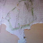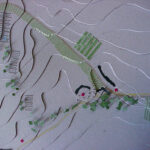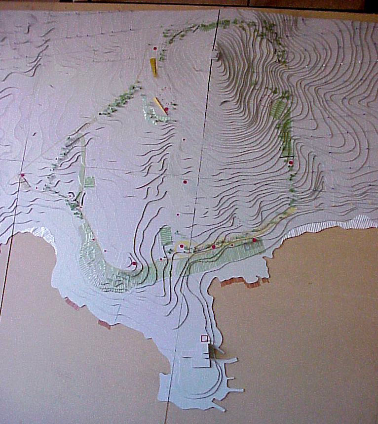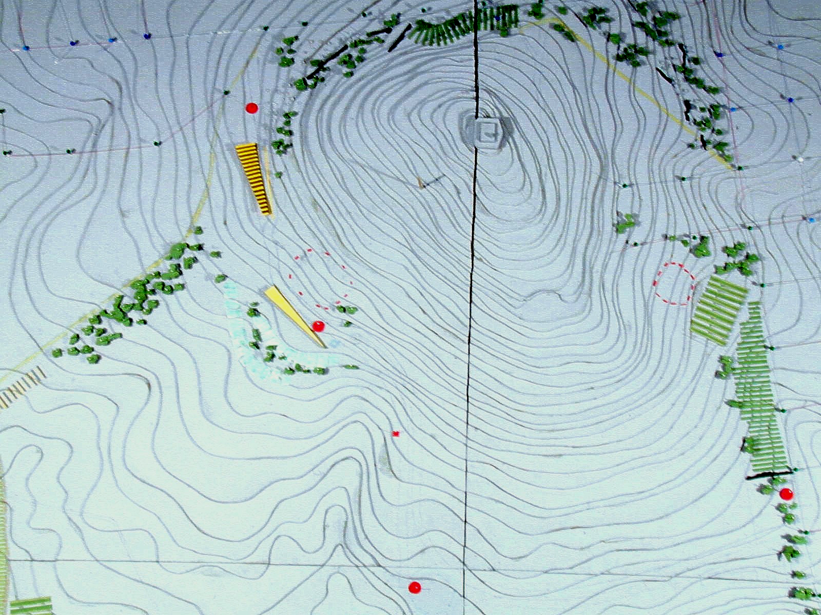Según estos hitos, de puede dividir al Cerro en varios dominios. Por ejemplo, desde la Fortaleza y el punto marcado en papel amarillo en la maqueta, se pueden ver estos hitos. Por el contrario, desde el centro de nuestro sitio no se puede ver ningún hito. Entonces dibujamos un segundo mapa.