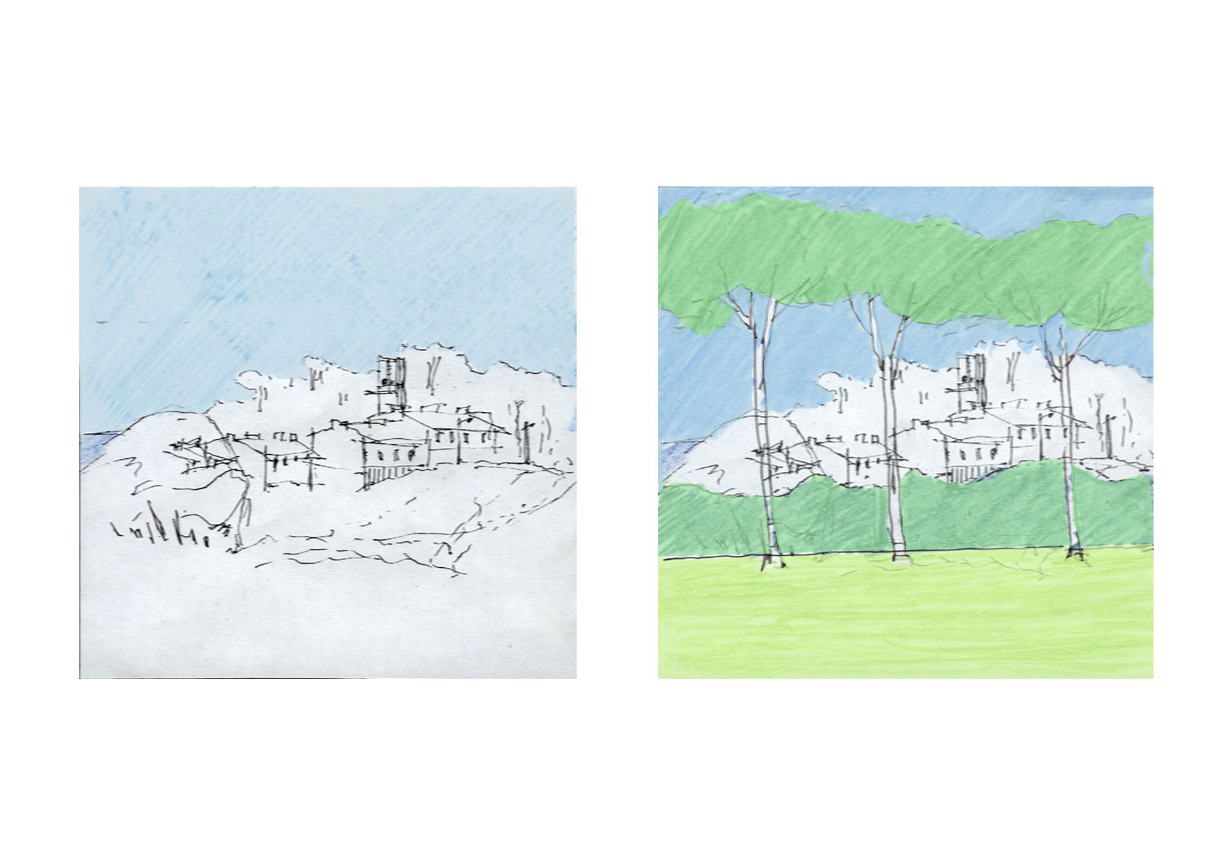 Estos tres edificios tienen una volumetría similar, una torre y un edificio relativamente alto. Esta composición de elementos es estable por ser clásica, encaja en un escenario pintoresco que se disfruta desde todo el Cerro, y no queremos cambiarla. Podemos dibujar un triángulo uniendo los tres puntos de ubicación de estos hitos. Cada lado de este triángulo mide aproximadamente 1500 m.