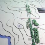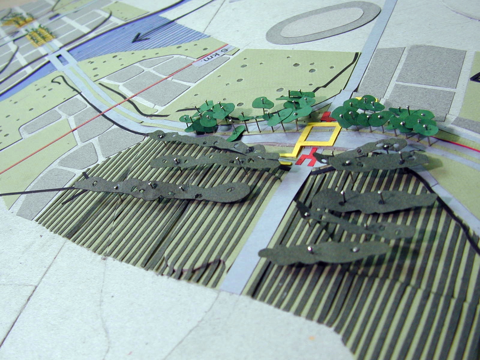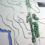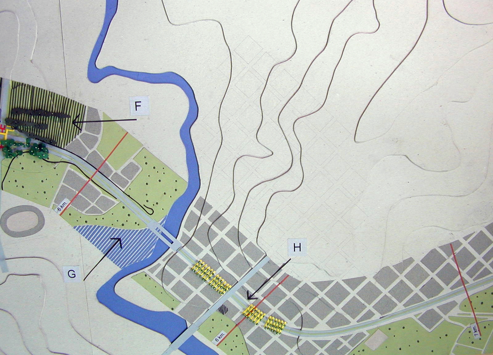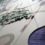 A partir de estas ideas se realizan dos maquetas. Una, titulada “Siete kilómetros de portal para Montevideo”, muestra las propuestas para los recorridos posibles, representando una faja de 500 metros de ancho posible de ser recorrida en cinco minutos por una persona caminando. En este caso la distancia es importante.