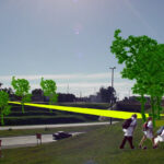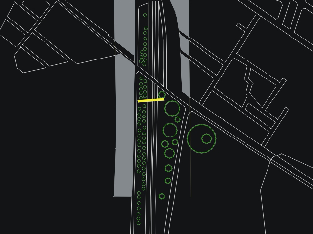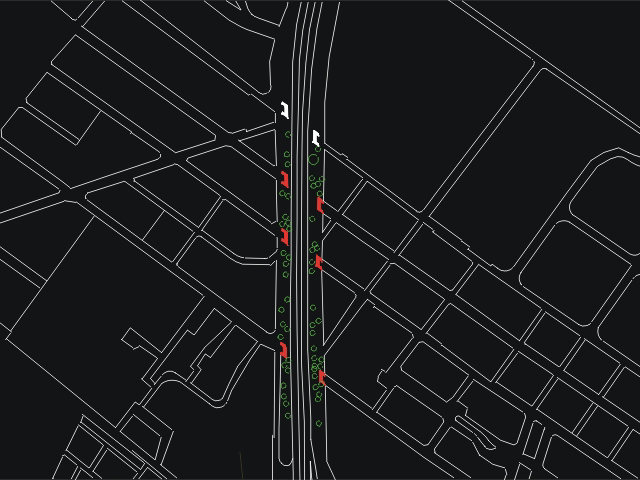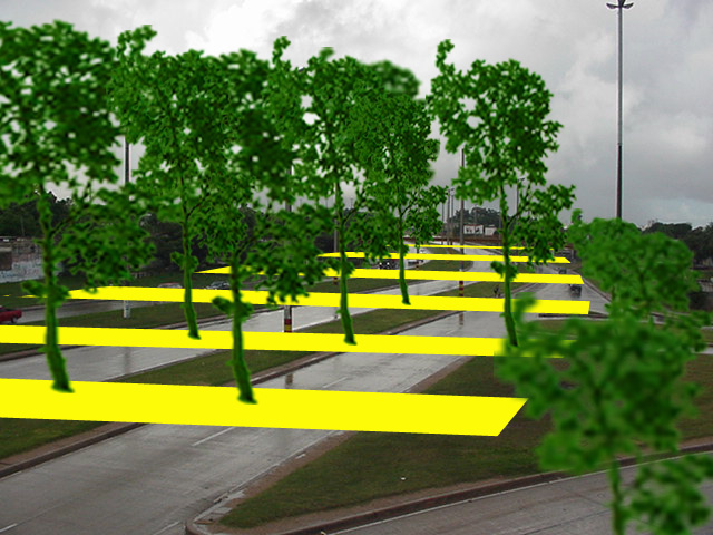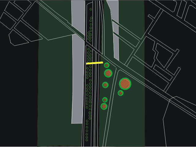 Una serie de puentes peatonales arbolados generarían un jardín elevado para el peatón y un juego de luces y sombras perceptible a alta velocidad.