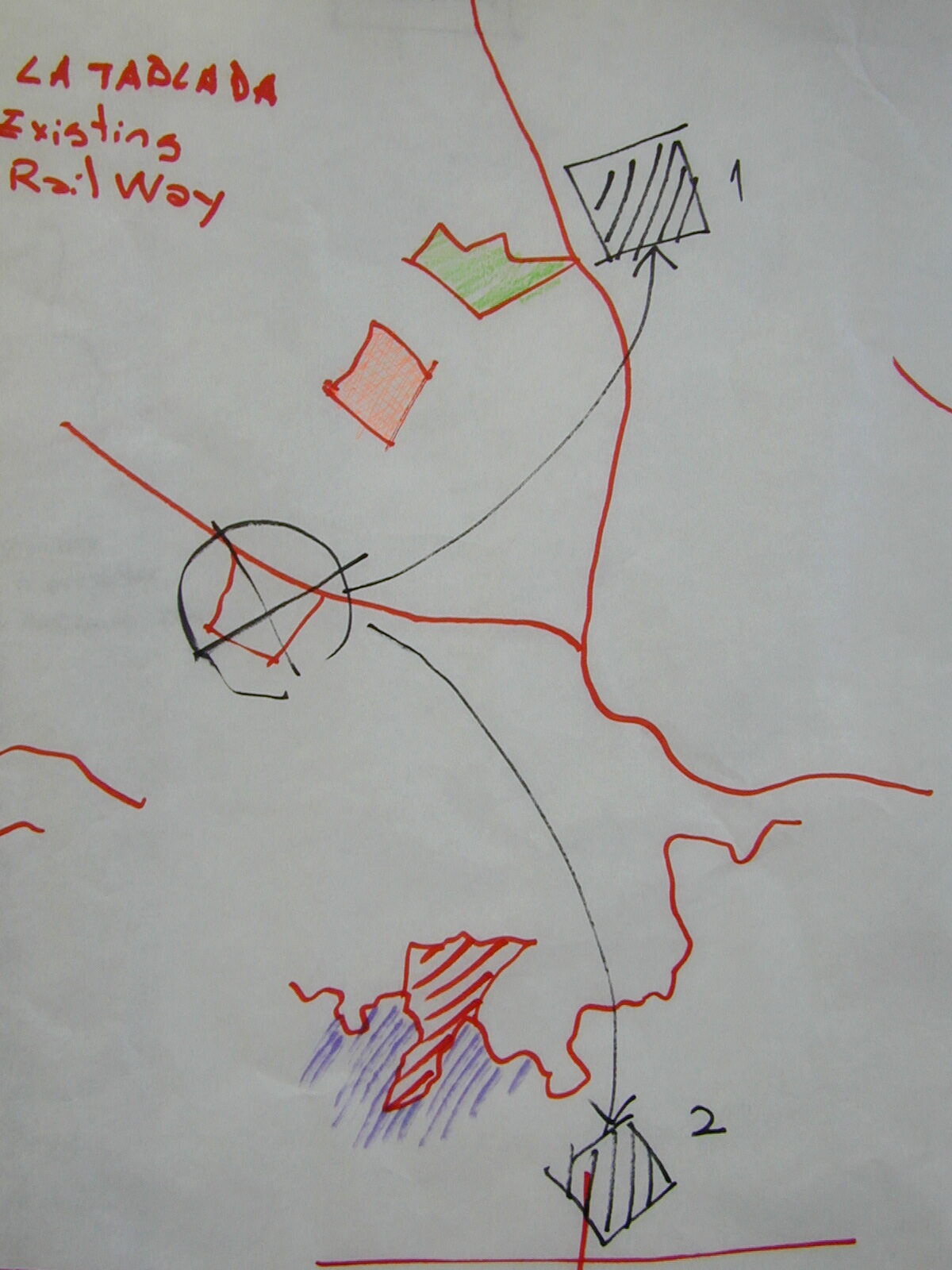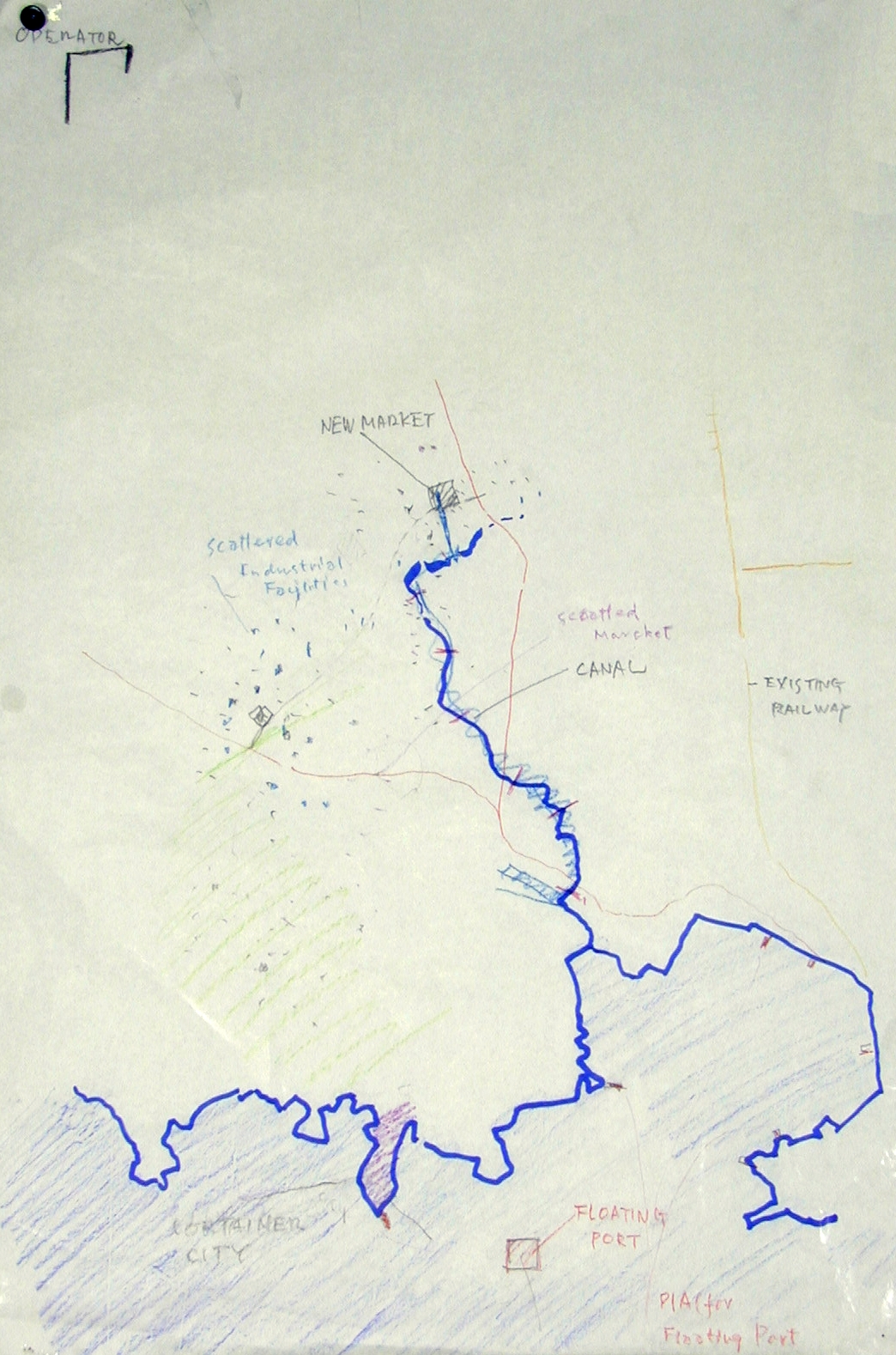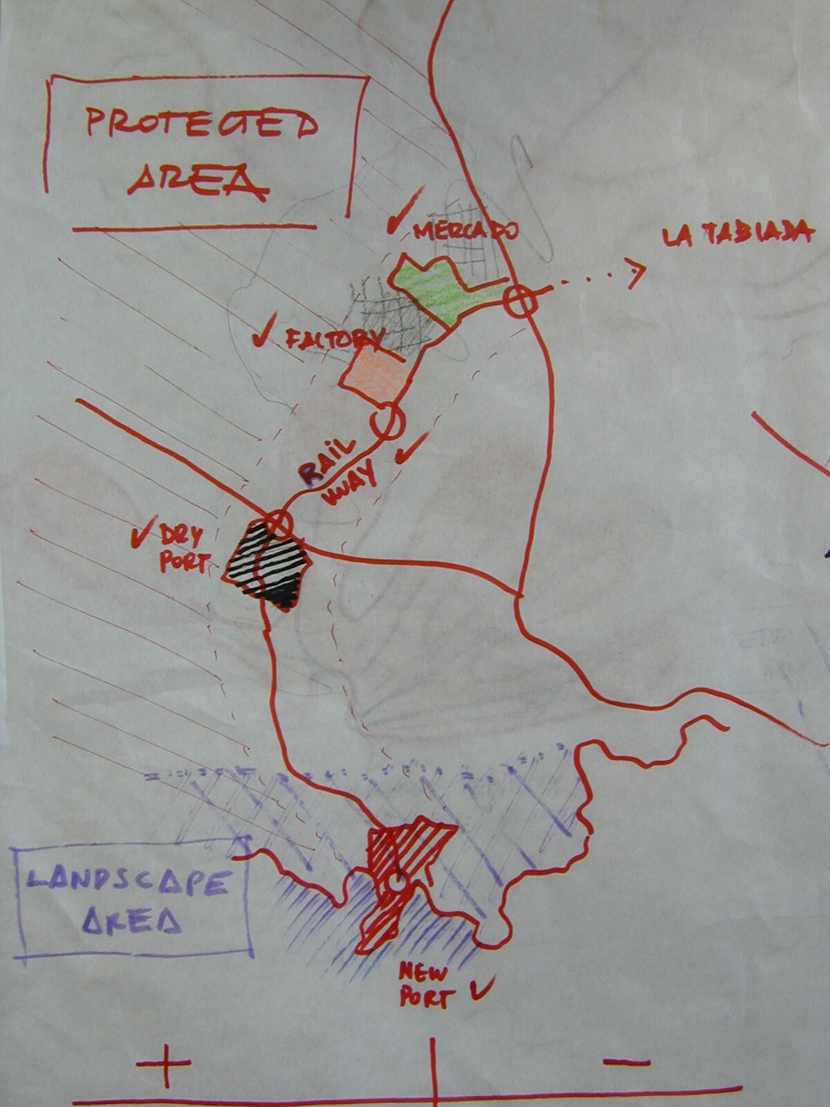 Respecto al mercado y a las industrias, planificamos el lugar del mismo modo que en el modelo rojo, pero optamos por un modelo disperso en el territorio, de pequeños establecimientos. Establecimientos desarrollados, no por la fuerza de grandes capitales, sino por pequeñas organizaciones, como los pequeños mercados que aún subsisten en la ciudad y en estas áreas.