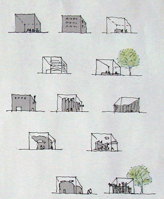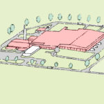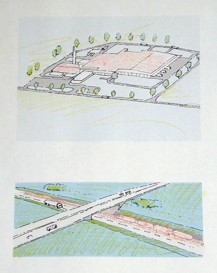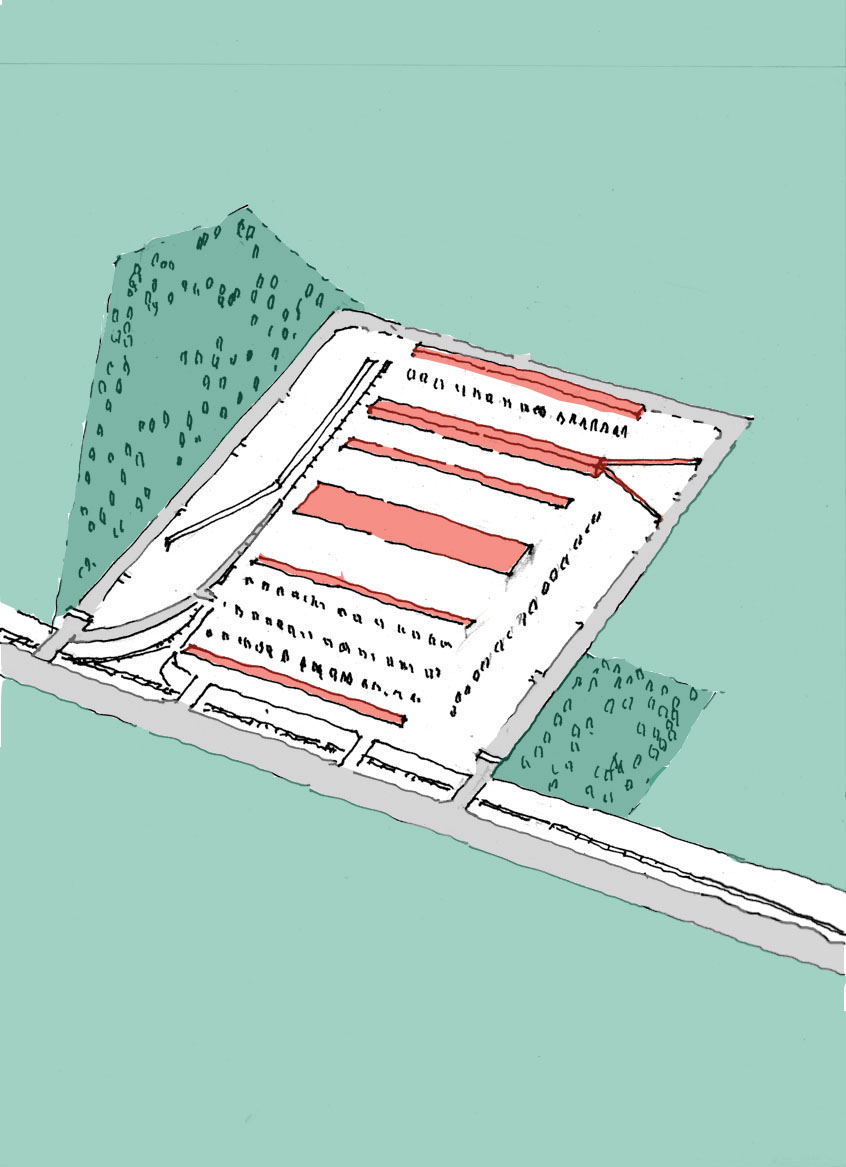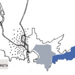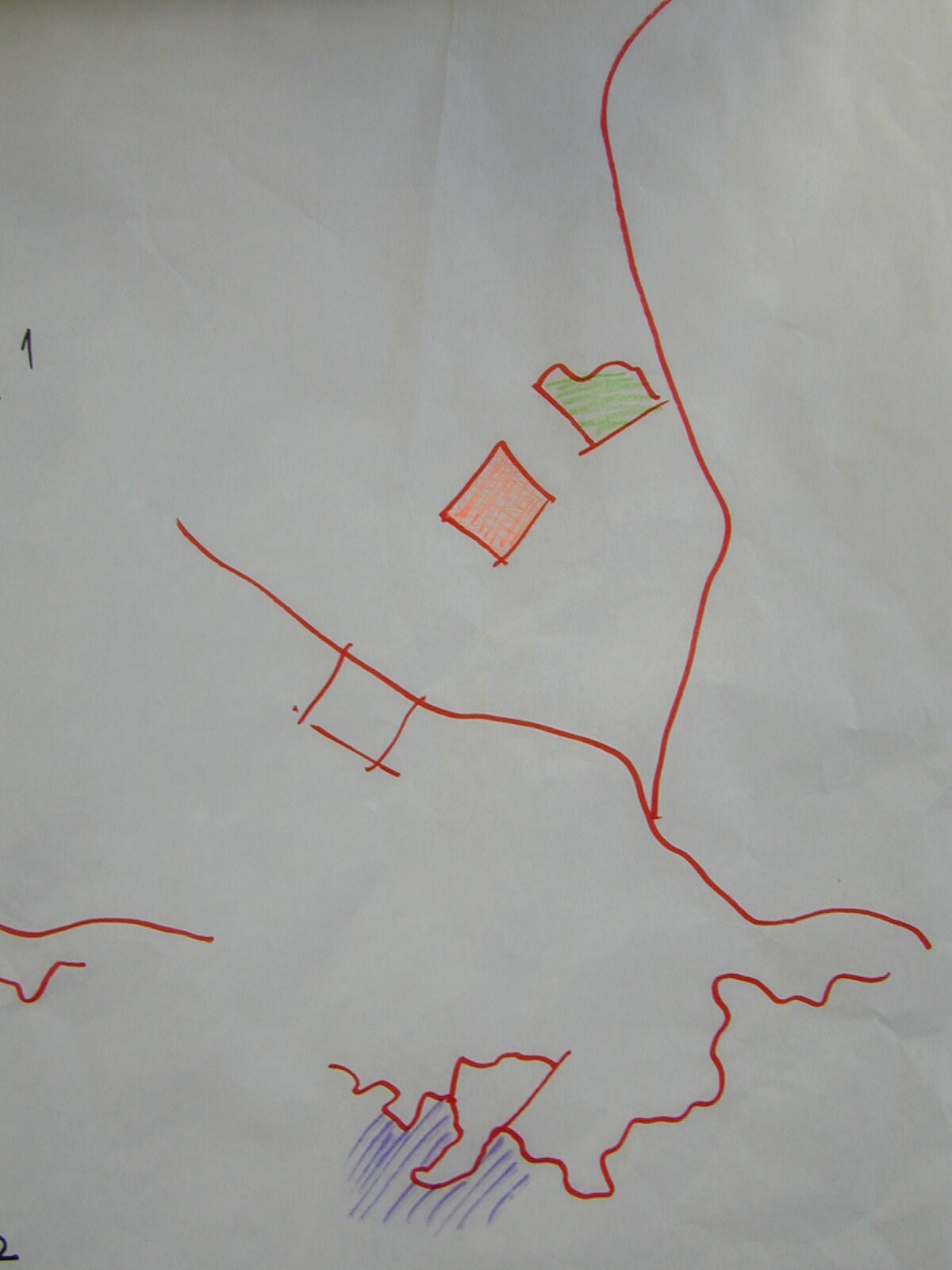 Respecto al mercado y a las industrias, planificamos el lugar del mismo modo que en el modelo rojo, pero optamos por un modelo disperso en el territorio, de pequeños establecimientos. Establecimientos desarrollados, no por la fuerza de grandes capitales, sino por pequeñas organizaciones, como los pequeños mercados que aún subsisten en la ciudad y en estas áreas.