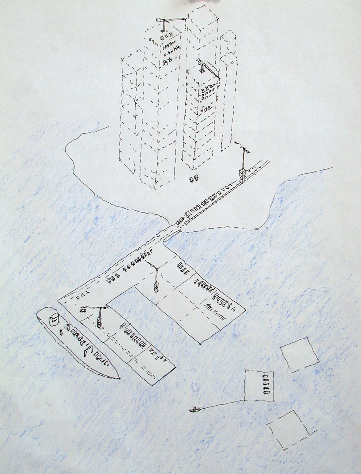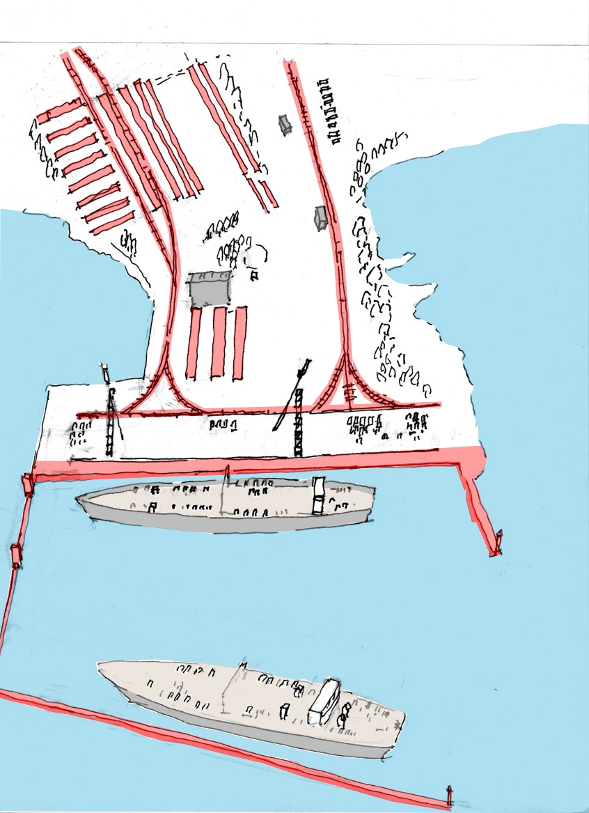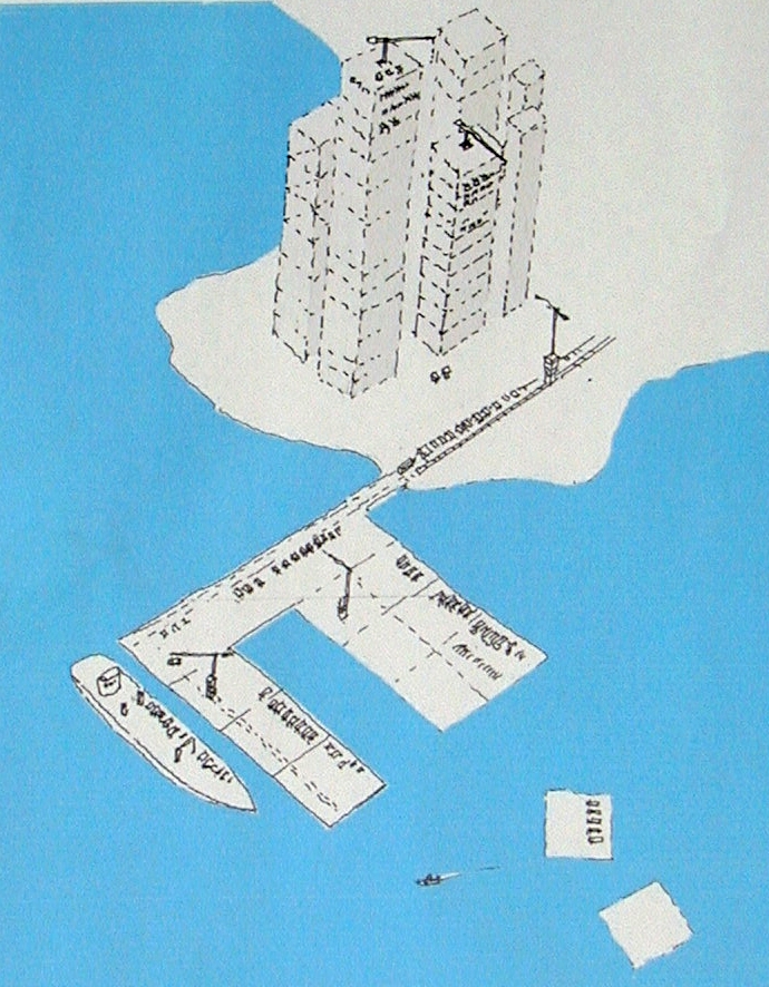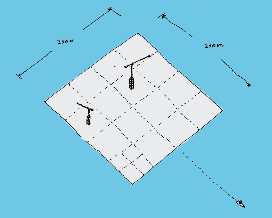 Es así que planteamos, como alternativa, construir un puerto flotante, diseñado para ser remolcado y poder dividirse en piezas pequeñas, de acuerdo a las funciones que deban cumplir y a las condiciones meteorológicas. La dimensión sería de 200 x 200 metros. Se harían pequeños muelles para conectar la costa con el puerto flotante. Se ajustaría a los diferentes tamaños de las embarcaciones pudiendo inclusive posicionarse lejos de la costa.
