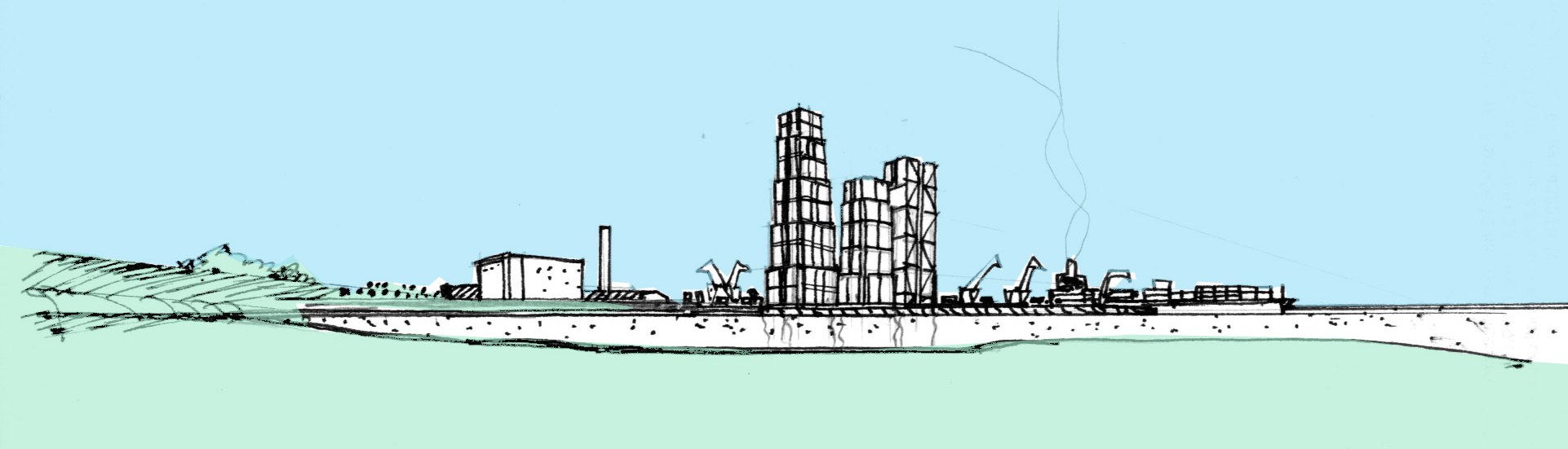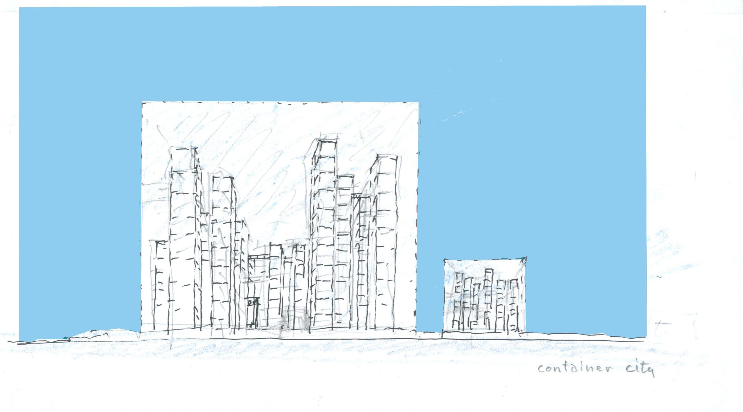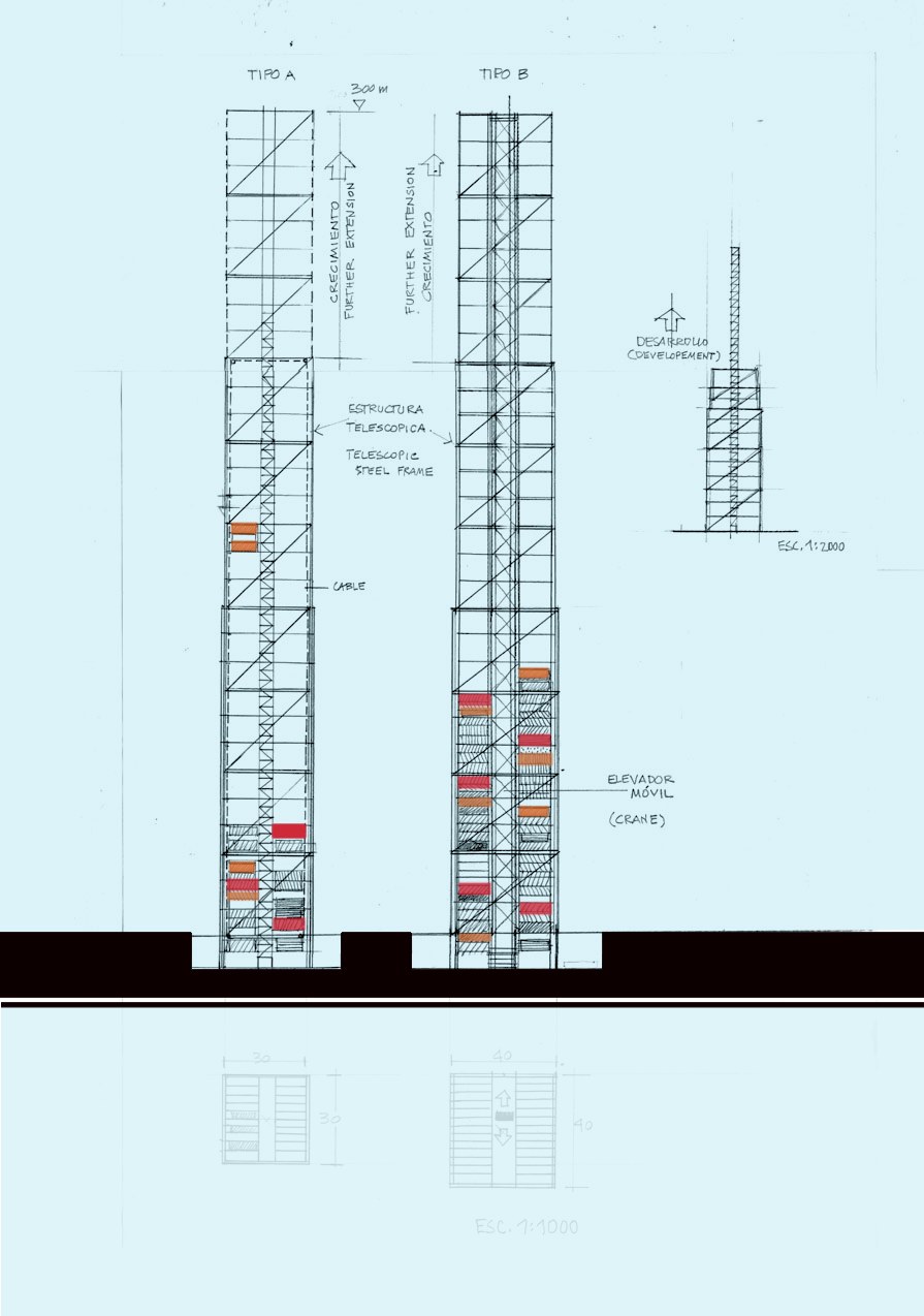 En el espacio del puerto nuevo, proponemos desarrollar un puerto seco o playa de contenedores. Se proyectará como un área de alta densidad con estructuras telescópicas que podrán elevarse hasta 500 metros de altura: una ciudad de contenedores.