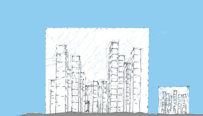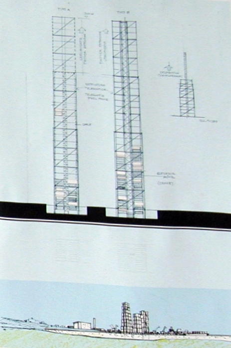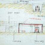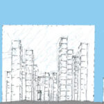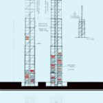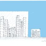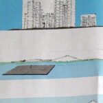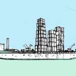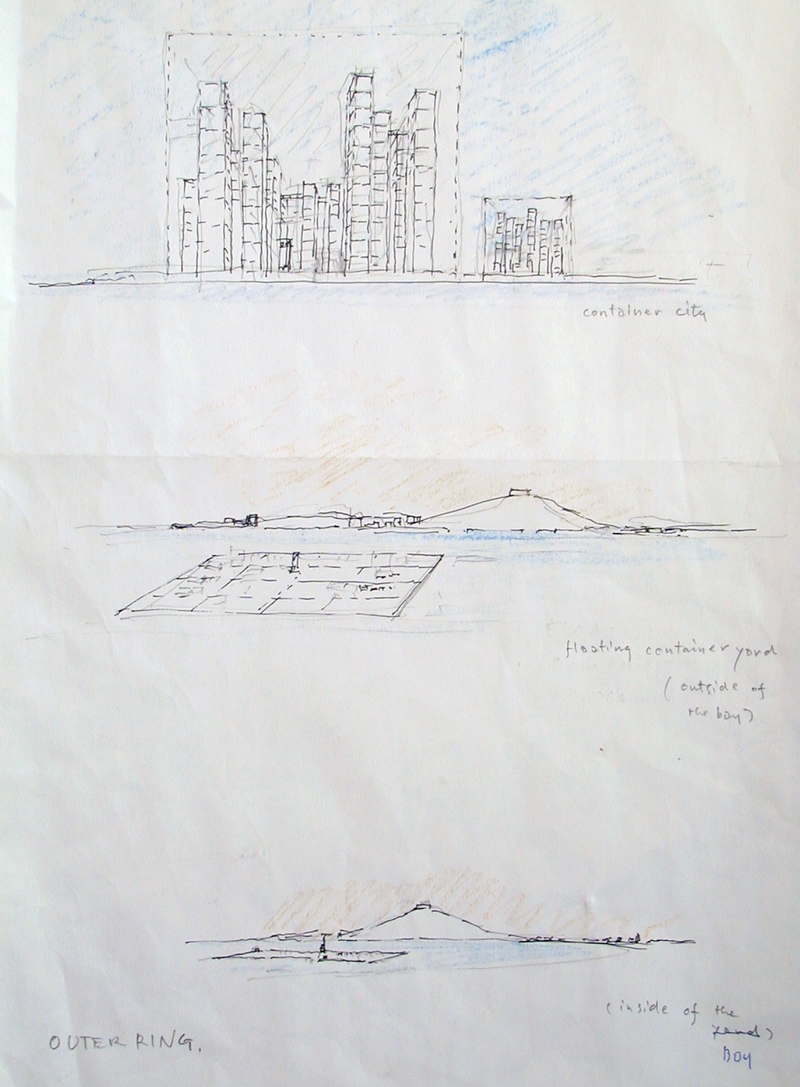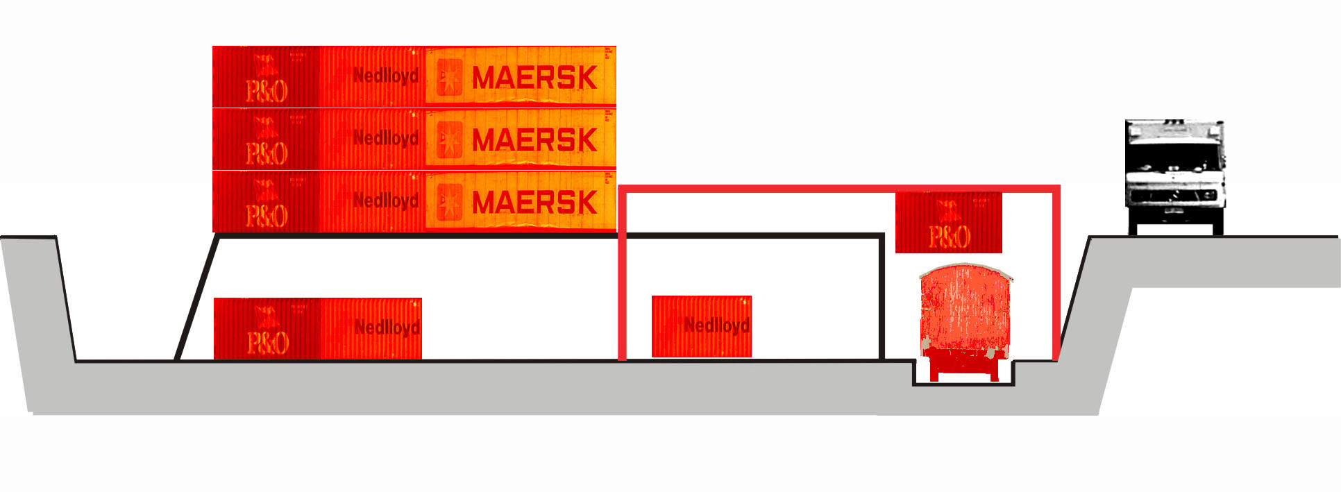 En el espacio del puerto nuevo, proponemos desarrollar un puerto seco o playa de contenedores. Se proyectará como un área de alta densidad con estructuras telescópicas que podrán elevarse hasta 500 metros de altura: una ciudad de contenedores.
