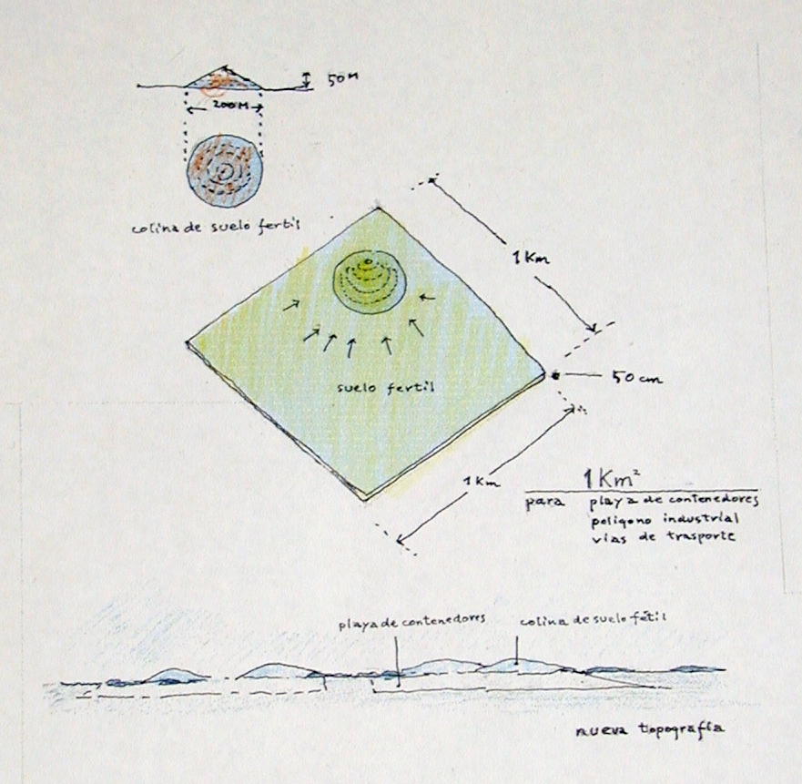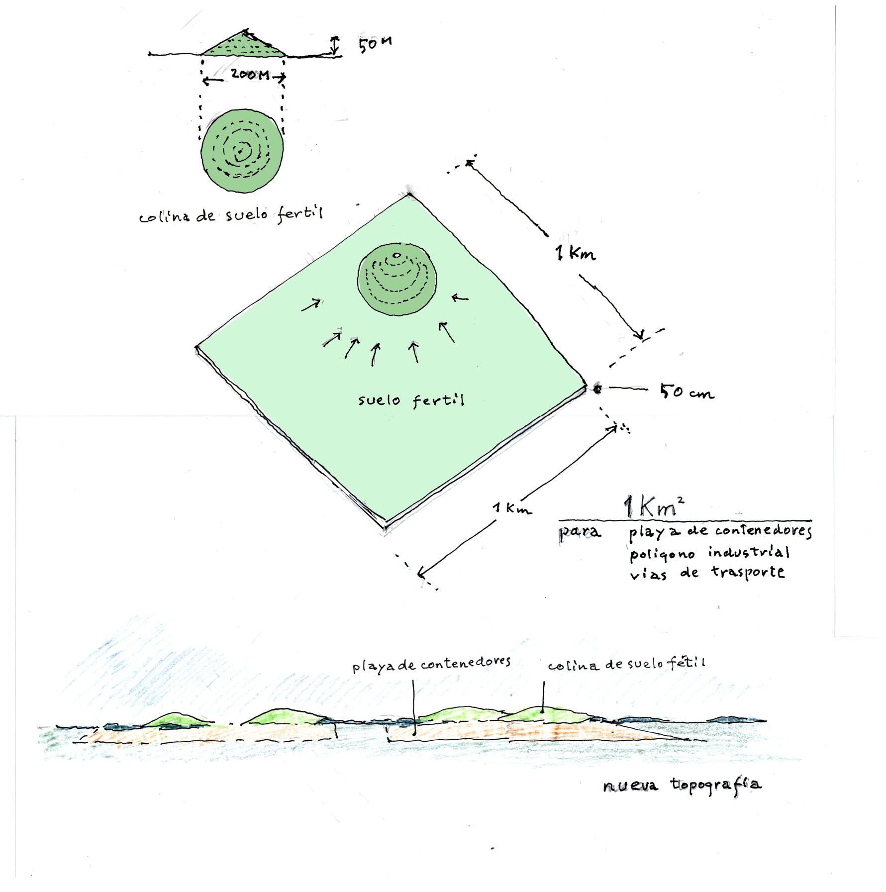 Pensando en la reversibilidad de esta transformación territorial conservaremos el «suelo fértil» en el lugar, surgiendo así una nueva topografía en el paisaje. Esta nueva topografía asegurará la conservación de los recursos existentes.